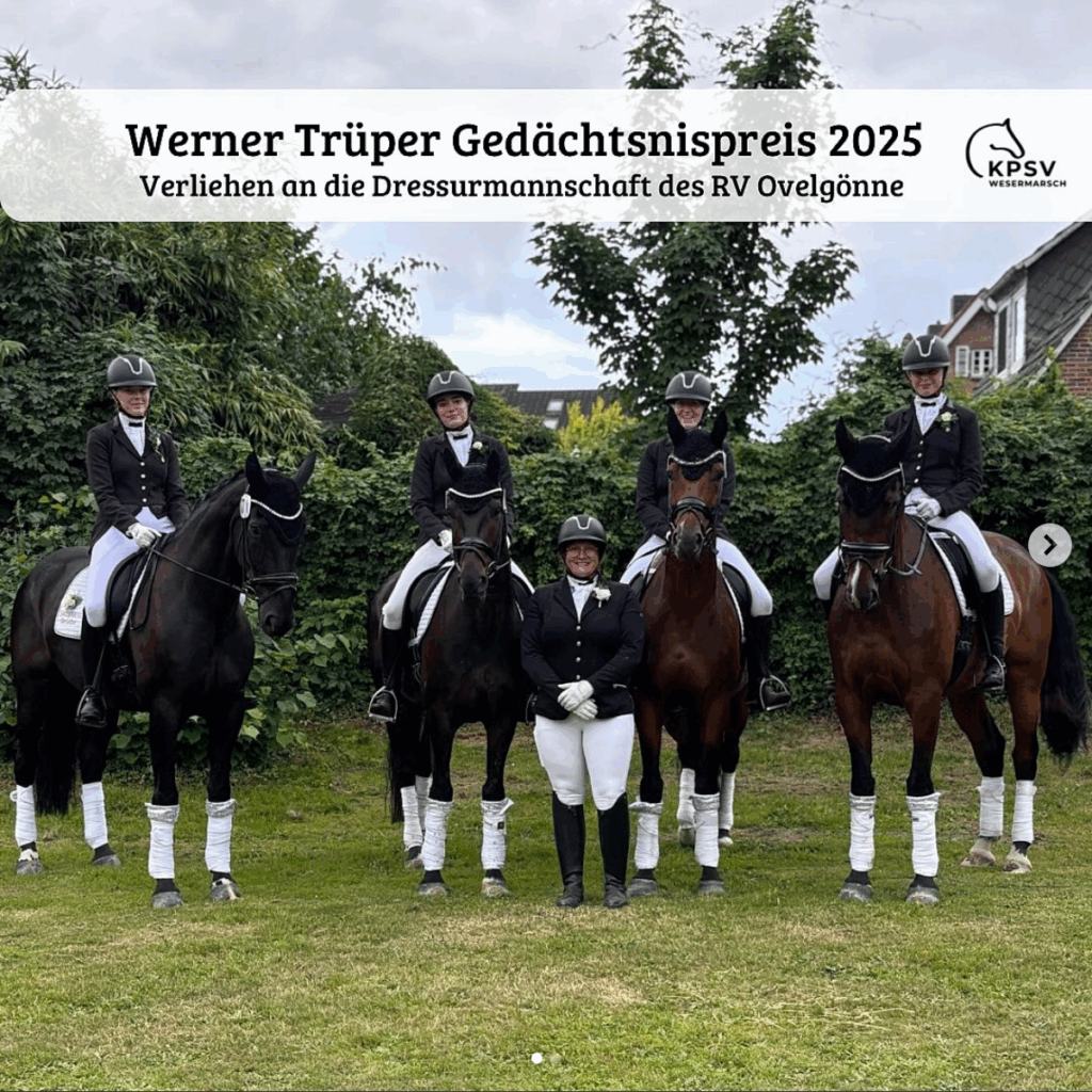 Wir freuen uns, im Jahr 2023 erstmals den Werner Trüper Gedächtnispokal überreichen zu können. Der Preis wird der Kür-Dressur-Mannschaft aus der Wesermarsch verliehen, die in Rastede am besten abschneidet.